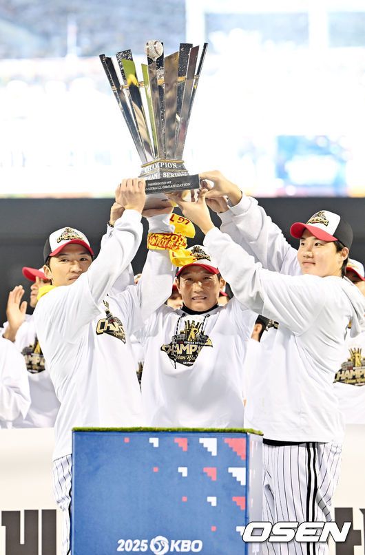2025 시즌 통합 우승을 거머쥔 LG 트윈스가 1일 오후 서울 잠실야구장에서 ‘한국시리즈 통합우승 IN 잠실' 행사를 가졌다. 이날 행사에는 팬들을 위한 트로피 퍼포먼스, 선수단 그라운드 행진, 비하인드 스몰토크, 선수단 샴페인 샤워, 이벤트 매치 등 다양한 프로그램이 펼쳐졌다. 잠실구장에서 LG 박해민, 염경엽 감독, 임찬규가 트로피를 들며 통합 우승