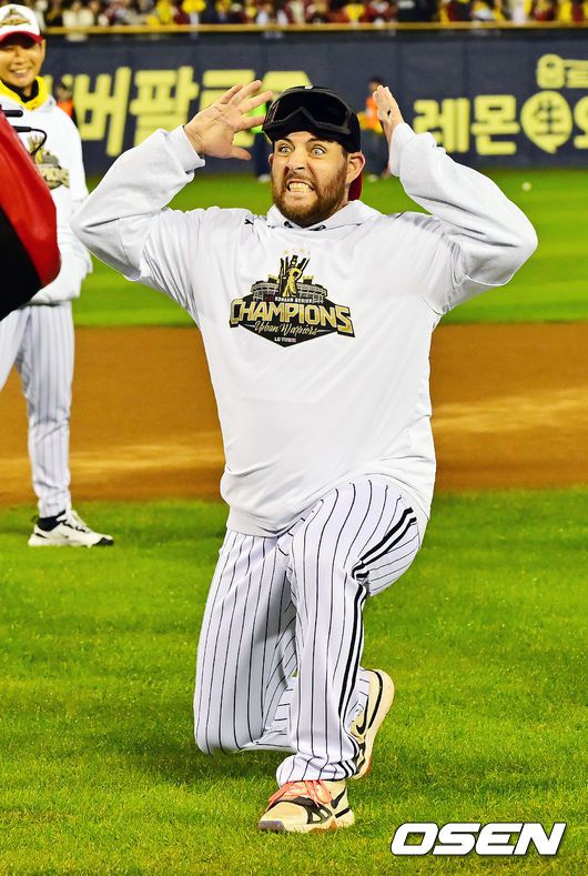 2025 시즌 통합 우승을 거머쥔 LG 트윈스가 1일 오후 서울 잠실야구장에서 ‘한국시리즈 통합우승 IN 잠실' 행사를 가졌다. 이날 행사에는 팬들을 위한 트로피 퍼포먼스, 선수단 그라운드 행진, 비하인드 스몰토크, 선수단 샴페인 샤워, 이벤트 매치 등 다양한 프로그램이 펼쳐졌다. LG 오스틴이 그라운드 위에서 춤을 추고 있다. 2025.11.01 / ru