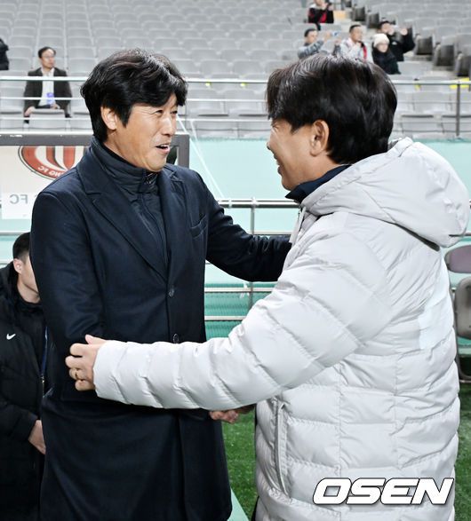 4일 오후 서울 상암동 서울월드컵경기장에서 '2025-2026 아시아축구연맹(AFC) 챔피언스리그 엘리트(ACLE) 리그' 스테이지 4차전 FC서울과 청두 룽청의 경기가 진행됐다. 서울은 ACLE 앞선 3경기에서 1승 1무 1패를 거둬 12개 팀 중 6위에 올라가 있다. 경기 전 서울 김기동 감독과 청두 서정원 감독이 악수를 나누고 있다. 2025.11.0