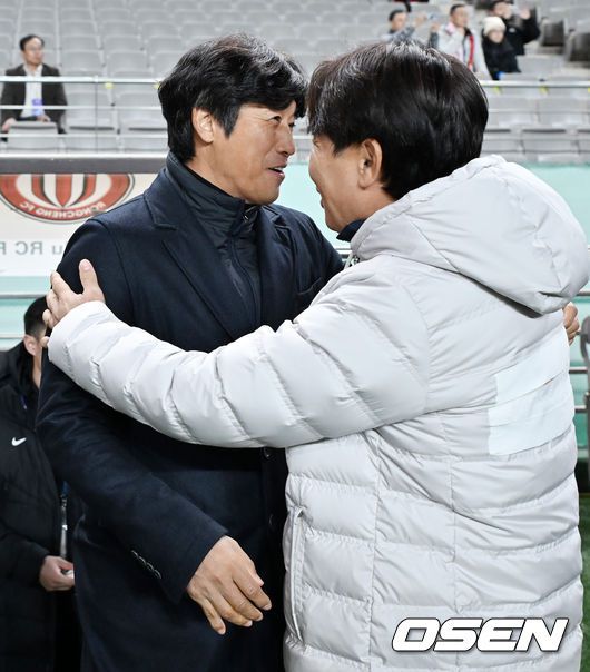 4일 오후 서울 상암동 서울월드컵경기장에서 '2025-2026 아시아축구연맹(AFC) 챔피언스리그 엘리트(ACLE) 리그' 스테이지 4차전 FC서울과 청두 룽청의 경기가 진행됐다. 서울은 ACLE 앞선 3경기에서 1승 1무 1패를 거둬 12개 팀 중 6위에 올라가 있다. 경기 전 서울 김기동 감독과 청두 서정원 감독이 악수를 나누며 포옹을 하고 있다. 20