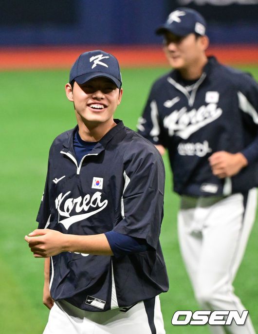 류지현 감독이 이끄는 야구 대표팀이 7일 고척스카이돔에서 훈련을 진행했다. 대표팀은 오는8일과 9일고척스카이돔에서 열리는 2025 K-베이스볼 시리즈 체코 대표팀과의 2경기를 시작으로15일과 16일 양일에 걸쳐 도쿄돔에서 일본 대표팀과 2경기를 치른다. 야구 대표팀 문동주가 몸을 풀고 있다. 2025.11.07 /cej@osen.co.kr