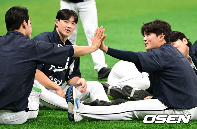 류지현 감독이 이끄는 야구 대표팀이 7일 고척스카이돔에서 훈련을 진행했다. 대표팀은 오는8일과 9일고척스카이돔에서 열리는 2025 K-베이스볼 시리즈 체코 대표팀과의 2경기를 시작으로15일과 16일 양일에 걸쳐 도쿄돔에서 일본 대표팀과 2경기를 치른다. 야구 대표팀 문동주, 김택연이 손을 맞대고 있다. 2025.11.07 /cej@osen.co.kr