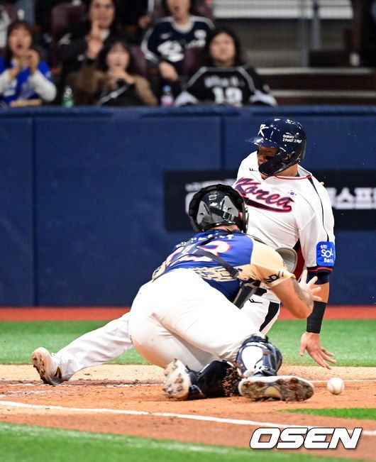8일 서울 구로구 고척스카이돔에서 ‘2025 NAVER K-BASEBALL SERIES’ 대한민국 야구 대표팀과 체코 야구 대표팀의 경기가 열렸다. 한국은 8일과 9일 2025 K-베이스볼 시리즈 체코 대표팀과의 2경기를 시작으로 15일과 16일 양일에 걸쳐 도쿄돔에서 일본 대표팀과 2경기를 치른다. 2회말 1사 3루 한국 한동희가 최재훈 희생타에 득점을