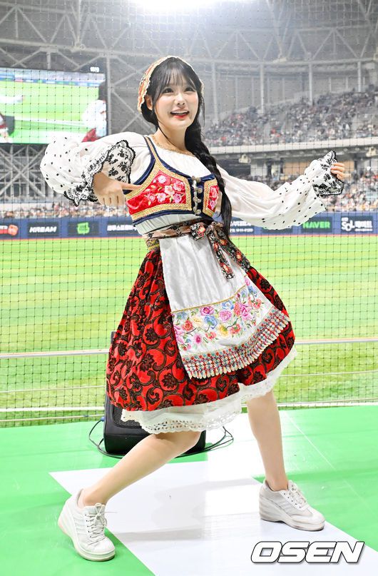 9일 서울 구로구 고척스카이돔에서 ‘2025 NAVER K-BASEBALL SERIES’ 대한민국 야구 대표팀과 체코 야구 대표팀의 평가전이 열렸다. 한국은9일 2025 K-베이스볼 시리즈 체코 대표팀과의 경기에 이어 오는15일과 16일 양일에 걸쳐 도쿄돔에서 일본 대표팀과 2경기를 치른다. 한국 최홍라 치어리더가 체코 전통 의상을 착용하고 공연을 펼치고