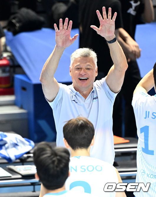 대한항공 점보스가 1위로 올라섰다. 대한항공은 12일 인천 계양체육관에서 열린 진에어 2024~2025 V-리그 삼성화재 블루팡스와의 경기에서 세트스코어 3대0(25-16, 25-22, 25-22)으로 승리했다. 경기 종료 후 대한항공 헤난 감독이 선수들과 승리의 기쁨을 나누고 있다. 2025.11.12 /sunday@osen.co.kr