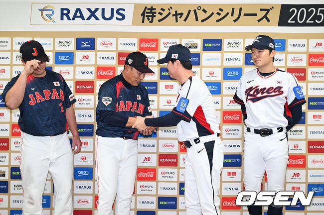 14일 일본 도쿄돔에서 월드베이스볼클래식(WBC) 대비 한일 평가전을 앞두고 공식 기자회견이 열렸다. 한국 대표팀은 14일일 훈련을 하고 15일과 16일 일본과 두 차례 평가전을 치른다. 일본 야구대표팀의 이바타 히로카즈 감독과 한국 야구대표팀의 류지현 감독이 악수를 나누고 있다. 2025.11.14 /cej@osen.co.kr
