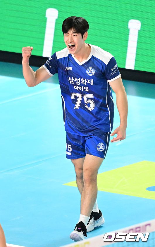 15일 오후 대전 충무체육관에서 ‘진에어 2025~2026 프로배구 V리그’ 남자부 삼성화재와 KB손해보험의 경기가 열렸다. 홈팀 삼성화재는 2승 5패 승점 7, 방문팀 KB손해보험은 4승 2패 승점 13을 마크하고 있다. 1세트, 삼성화재 김요한이 서브 에이스에 기뻐하고 있다. 2025.11.14 / dreamer@osen.co.kr