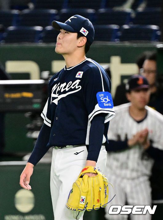 15일 일본 도쿄돔에서 ‘2025 NAVER K-BASEBALL SERIES’ 대한민국과 일본의 1차전 경기가 열렸다. 한국은 곽빈, 일본은 소타니 류헤이를 선발투수로 내세웠다. 5회말 무사 만루에서 대한민국 성영탁이 일본 사카모토에게 투수 앞 내야안타로 실점하며 아쉬워하고 있다. 2025.11.15. /cej@osen.co.kr