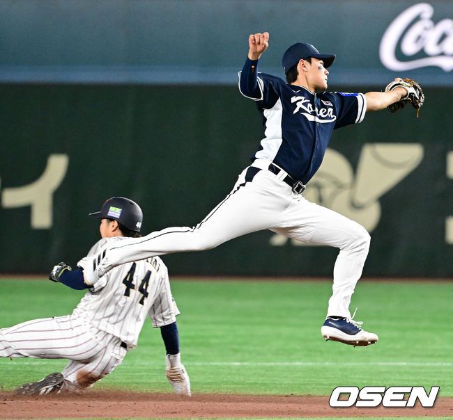 15일 일본 도쿄돔에서 ‘2025 NAVER K-BASEBALL SERIES’ 대한민국과 일본의 1차전 경기가 열렸다. 한국은 곽빈, 일본은 소타니 류헤이를 선발투수로 내세웠다. 6회말 1사 1루에서 대한민국 김주원이 일본 이시가미에게 2루 도루를 허용하고 있다. 2025.11.15. /cej@osen.co.kr