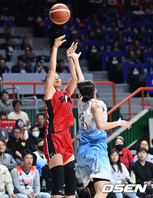 16일 부산 사직실내체육관에서 BNK금융 2025~2026 여자프로농구 부산 BNK와 인천 신한은행의 경기가 열렸다. ‘디펜딩 챔피언’ 부산 BNK와 인천 신한은행의 2025~2026 공식 개막전이다. 부산 BNK 변소정이 인천 신한은행 최이샘의 마크를 피해 3점슛을 시도하고 있다. 2025.11.16 / foto0307@osen.co.kr