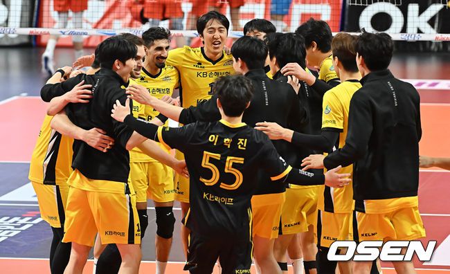 18일 부산 강서실내체육관에서 진에어 2025-2026 V리그 남자부 OK저축은행과 KB손해보험의 경기가 열렸다. 부산 시대를 연 OK저축은행의 신영철 감독이 한국 최초 300승을 기록할지 기대된다. KB손해보험 모하메드 야쿱과 선수들이 OK저축은행에 3-1로 승리한 후 기쁨을 나누고 있다. 2025.11.18 / foto0307@osen.co.kr