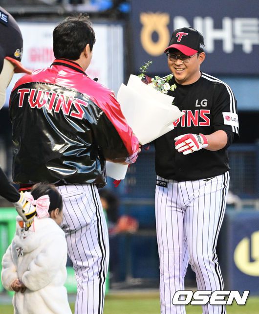 프로야구 LG 트윈스가 22일 서울 잠실구장에서 ‘2025러브기빙페스티벌with챔피언십’을 개최했다. 이번 행사는 2008년 ‘LG 트윈스 러브페스티벌’로 야구 꿈나무들을 위한 후원행사로 시작해, 2017년부터 ‘러브기빙데이’로 이름을 바꿔 팬과 선수단이 함께하는 자선행사다. 박동원이 현역에서 은퇴한 안익훈에게 꽃다발을 전달하고 있다. 2025.11.22