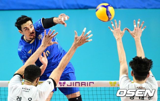 26일 서울 장충체육관에서 프로배구 진에어 2025~26 V리그 우리카드와 현대캐피탈의 경기가 열렸다. 홈팀 우리카드는 4승 5패 승점 11로 5위, 방문팀 현대캐피탈은 4승 4패 승점 13으로 4위를 기록 중이다. 1세트 우리카드 아라우조가 강타를 하고 있다. 2025.11.26/cej@osen.co.kr
