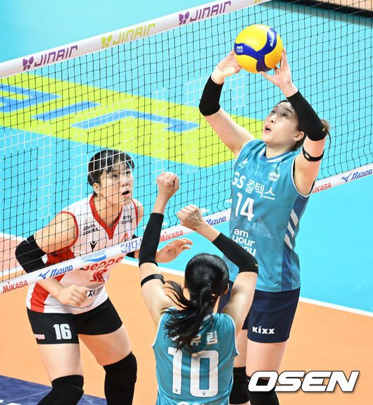 5일 오후 서울 장충체육관에서 프로배구 진에어 2025~26 V리그 GS칼텍스와 페퍼저축은행의 경기가 열렸다. 페퍼저축은행은 6승 5패 승점 17점으로 리그 4위, GS칼텍스는 5승 6패 승점 16점으로 5위에 올라 있다. 2세트 GS칼텍스 김지원이 토스를 하고 있다. 2025.12.05 /sunday@osen.co.kr