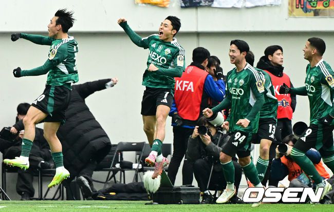 2025 하나은행 코리아컵 전북FC와 광주FC의 결승전이 6일 서울 마포구 서울월드컵경기장에서 열렸다. 시민구단 광주는 사상 첫 코리안컵 우승에 도전, 전북은 올해 K리그1 우승에 이어 두 번째 더블을 노린다. 전반 선제골을 넣은 전북 이동준(가운데)가 기뻐하고 있다. 2025.12.06 /cej@osen.co.kr