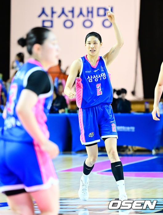 6일 오후 용인실내체육관에서 BNK금융 2025-26 여자프로농구 삼성생명과 BNK 썸의 경기가 열렸다. 중위권 경쟁을 펼치는 두 팀의 대결이다. 삼성생명은 4위(2승3패), BNK 썸은 3위(3승 2패)를 기록중이다. 4쿼터 삼성생명 이해란이 득점에 기뻐히고 있다. 2025.12.06 /jpnews@osen.co.kr