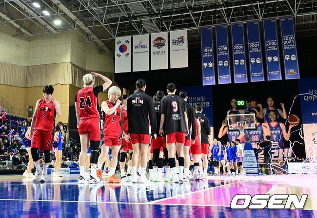 6일 오후 용인실내체육관에서 BNK금융 2025-26 여자프로농구 삼성생명과 BNK 썸의 경기가 열렸다. 이날 삼성생명은 이해란이 31득점을 올리는 활약 속에 BNK 썸에 65-62 승리를 거뒀다. 경기를 마치고 BNK 썸 선수들이 패배를 아쉬워하고 있다. 2025.12.06 /jpnews@osen.co.kr