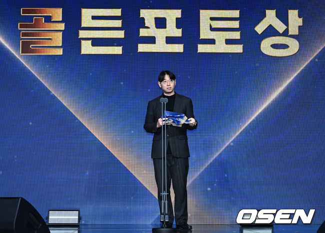 LG 트윈스 박해민이 9일 서울 송파구 잠실동 롯데호텔 월드에서 진행된 2025 신한은행 SOL 뱅크 KBO 골든글러브 시상식에서 골든포토상을 수상했다. 한국스포츠사진기자회 지형준 회장이 발표를 하고 있다. 올 한 해 최고의 장면을 연출한 선수에게 시상하는 골든포토상은 한국스포츠사진기자회의 특별상으로 1994년 신설되었다. 올해 선정된 사진은 LG 박해민이