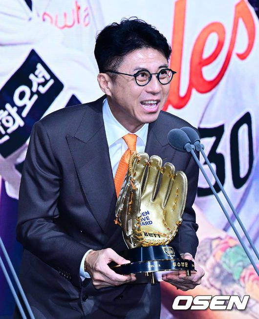 9일 오후 서울 송파구 잠실동 롯데호텔 월드에서 2025 신한은행 SOL 뱅크 KBO 골든글러브 시상식이 열렸다. KBO 골든글러브 시상식은 포지션별 최고의 선수를 가리는 자리로 올 시즌의 대미를 장식하는 자리다. 한화 폰세가 투수 부문 골든글러브를 수상했다. 손혁 단장이 대리 수상하며 소감을 말하고 있다. 2025.12.09 /jpnews@osen.co.