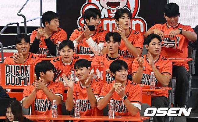 9일 부산 강서실내체육관에서 진에어 2025-2026 V리그 남자부 OK저축은행과 KB손해보험의 경기가 열렸다. 홈 2연승을 기록중인 OK저축은행이 이번 경기에서도 승리, 연승을 이어갈지 기대된다. 롯데 자이언츠 신인 선수들이 응원을 하고 있다. 2025.12.09 / foto0307@osen.co.kr