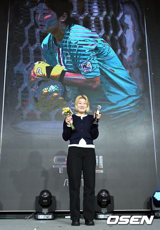 2025 한국여자축구연맹 시상식이 10일 서울 송파구 올림픽파크텔에서 열렸다. 시상식에서는 2025년 시즌 WK리그를 빛낸 선수들을 대상으로 베스트 11, 최다 득점상, 최다 도움상, 최우수선수(MVP)를 발표한다. 신인상을 수상한 서울시청 우서빈이 포즈를 취하고 있다. 2025.12.10 /cej@osen.co.kr