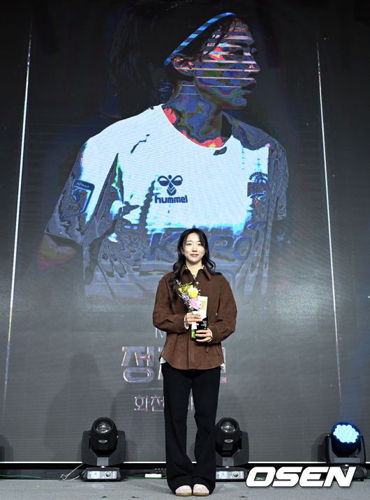 2025 한국여자축구연맹 시상식이 10일 서울 송파구 올림픽파크텔에서 열렸다. 시상식에서는 2025년 시즌 WK리그를 빛낸 선수들을 대상으로 베스트 11, 최다 득점상, 최다 도움상, 최우수선수(MVP)를 발표한다. MVP를 수상한 화천KSPO 정지연이 소감을 말하고 있다. 2025.12.10 /cej@osen.co.kr