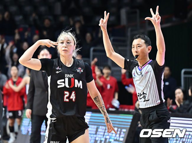 10일 부산 사직실내체육관에서 BNK금융 2025~2026 여자프로농구 부산 BNK와 청주 KB스타즈의 경기가 열렸다. 공동 2위를 노리는 BNK와 단독 2위로 격차를 벌리려는 KB스타즈가 맞대결을 펼쳤다. 부산 BNK 김소니아가 3점슛을 성공시키고 세리머니를 하고 있다. 2025.12.10 / foto0307@osen.co.kr