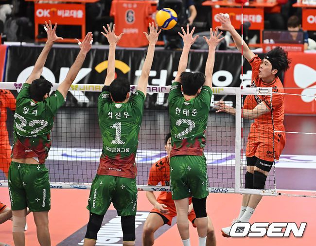 17일 부산 강서실내체육관에서 진에어 2025-2026 V리그 남자부 OK저축은행과 우리카드의 경기가 열렸다. 두 팀은 이번 시즌 만났다 하면 5세트 접전을 벌이고 있다. 이번 경기에서도 5세트 접전이 벌어질지 주목된다. OK저축은행 전광인이 아산 우리은행 블로킹을 뚫고 스파이크를 날리고 있다. 2025.12.17 / foto0307@osen.co.kr