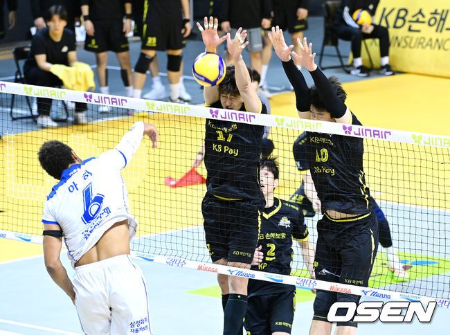 18일 경기도 의정부시 경민대학교 체육관에서 ‘진에어 2025~2026 프로배구 V리그’ 남자부 KB손해보험과 삼성화재의 경기가 열렸다. 홈팀 KB손해보험은 7승 8패 승점 22, 방문팀 삼성화재는 2승 13패 승점 7을 마크하고 있다. 1세트, KB손해보험 박상하와 나경복이 삼성화재 아히의 공격을 블로킹 하고 있다. 2025.12.18 / dreamer@