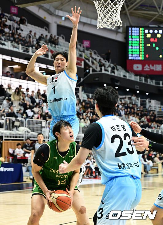 19일 오후 수원 KT 소닉붐 아레나에서 2025-2026 LG전자 프로농구 수원 KT와 원주 DB의 경기가 열렸다. KT는 11승 11패(6위), DB는 12승 9패(4위)를 기록중이다.1쿼터 DB 정효근이 KT 수비를 피해 슛을 시도하고 있다. 2025.12.19 /jpnews@osen.co.kr