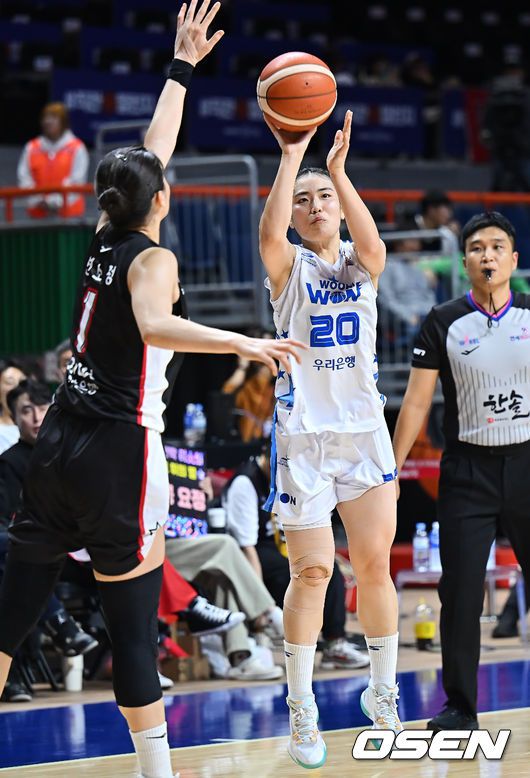 19일 부산 사직실내체육관에서 BNK금융 2025~2026 여자프로농구 부산 BNK와 아산 우리은행의 경기가 열렸다. 시즌 첫 3연승을 달리고 있는 부산 BNK와 아산 우리은행이 연승 행진을 이어가기 위해 맞대결을 펼친다. 아산 우리은행 이명관이 부산 BNK 변소정의 마크를 피해 3점슛을 시도하고 있다. 2025.12.19 / foto0307@osen.co