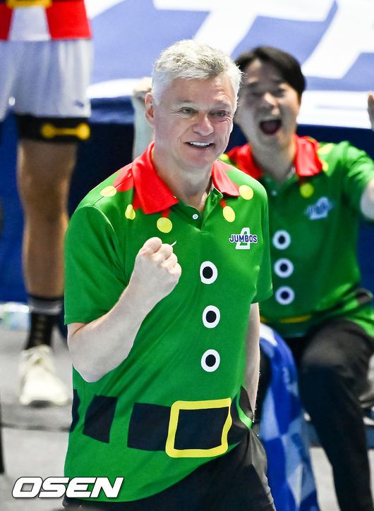 19일 오후 인천 계양체육관에서 진에어 2025-2026 V리그 남자부 대한항공과 한국전력의 경기가 진행됐다. 홈팀 대한항공은 1위(12승 2패·승점 34), 어웨이팀 한국전력은 5위(8승 6패·승점 22)에 위치하고 있다. 2세트 대한항공 헤난 감독이 득점 후 기뻐하고 있다. 2025.12.19 / soul1014@osen.co.kr