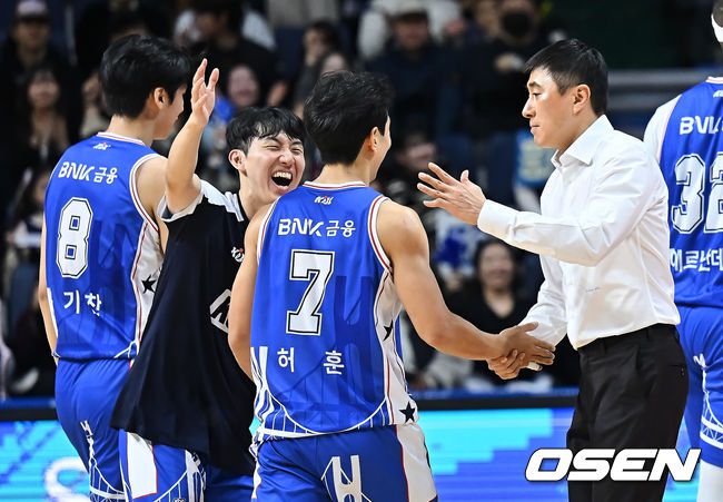 21일 부산 사직체육관에서 2025-2026 LG전자 프로농구 부산 KCC와 수원 KT의 경기가 열렸다. 5연승의 상승세를 탄 KCC가 연승을 이어갈 지 기대된다. 부산 KCC 이상민 감독이 나바로의 득점에 패스로 도움을 준 허훈을 반기고 있다. 2025.12.21 / foto0307@osen.co.kr