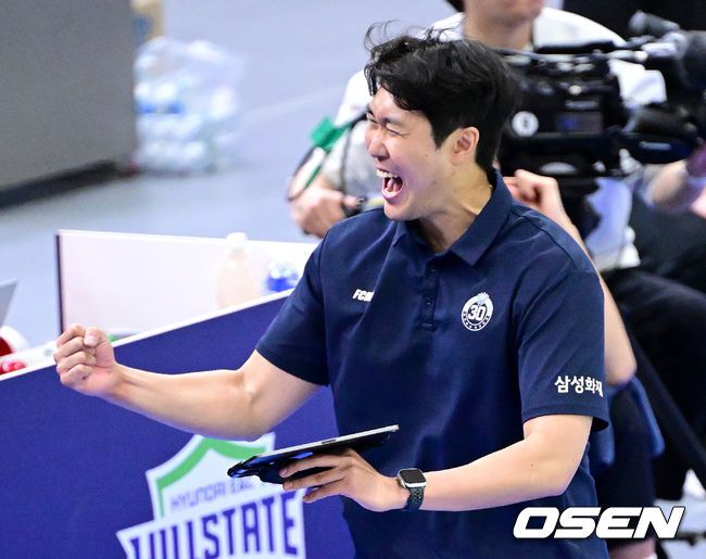 23일 경기도 수원체육관에서 ‘진에어 2025~2026 프로배구 V리그’ 남자부 한국전력과 삼성화재의 경기가 열렸다. 홈팀 한국전력은 8승 7패 승점 22, 방문팀 삼성화재는 2승 14패 승점 7을 마크하고 있다. 1세트를 따낸 삼성화재 고준용 감독대행이 기뻐하고 있다. 2025.12.23 / dreamer@osen.co.kr