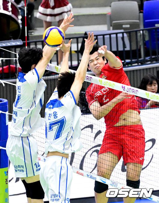 23일 경기도 수원체육관에서 ‘진에어 2025~2026 프로배구 V리그’ 남자부 한국전력과 삼성화재의 경기가 열렸다. 홈팀 한국전력은 8승 7패 승점 22, 방문팀 삼성화재는 2승 14패 승점 7을 마크하고 있다. 2세트, 한국전력 서재덕이 공격을 시도하고 있다. 2025.12.23 / dreamer@osen.co.kr