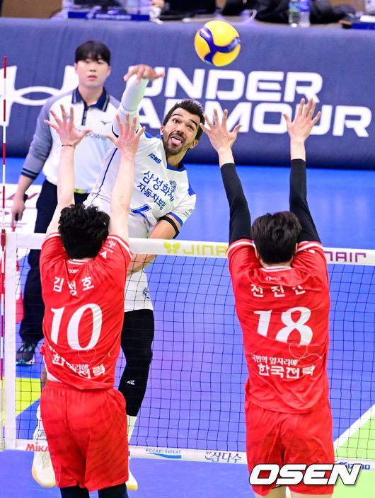 23일 경기도 수원체육관에서 ‘진에어 2025~2026 프로배구 V리그’ 남자부 한국전력과 삼성화재의 경기가 열렸다. 홈팀 한국전력은 8승 7패 승점 22, 방문팀 삼성화재는 2승 14패 승점 7을 마크하고 있다. 1세트, 삼성화재 아히가 공격을 시도하고 있다. 2025.12.23 / dreamer@osen.co.kr