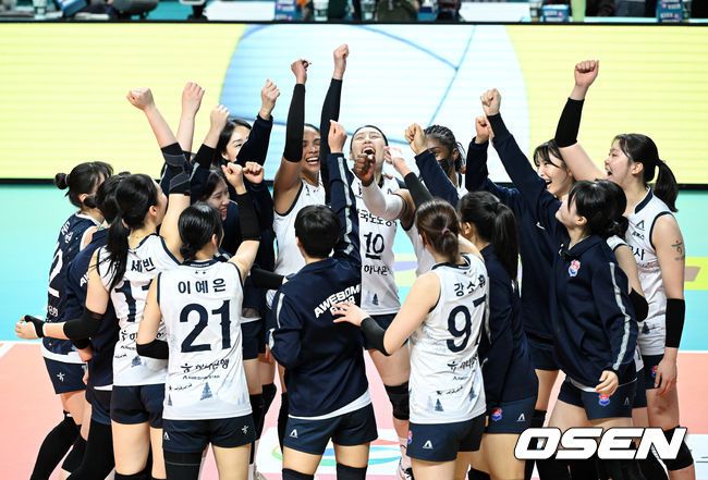 한국도로공사는 23일 서울 장충체육관에서 열린 진에어 2025~2026 V리그 여자부 3라운드 GS칼텍스와의 원정경기에서 세트스코어 3-2(21-25 21-25 25-17 25-21 15-11)로 역전승을 거뒀다. 경기 종료 후 한국도로공사 선수들이 승리의 기쁨을 나누고 있다. 2025.12.23 /sunday@osen.co.kr