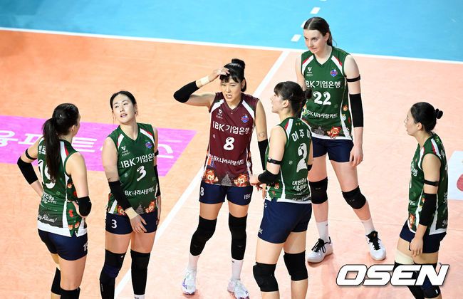 흥국생명은 24일 인천 삼산월드체육관에서 열린 진에어 2025~2026 프로배구 V-리그 여자부 홈경기에서 IBK기업은행을 3-0(25-19, 25-19, 26-24)으로 완파했다. 경기 종료 후 IBK기업은행 선수들이 패배에 아쉬워하고 있다. 2025.12.24 /sunday@osen.co.kr