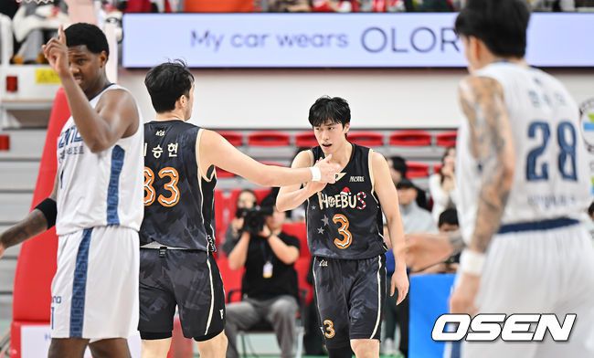 25일 울산 동천체육관에서 2025-2026 LG전자 프로농구 울산 현대모비스와 고양 소노의 경기가 열렸다. 8승 15패로 8위에 나란히 선 울산 현대모비스와 고양 소노의 세 번째 맞대결은 연패를 끊고 반등에 나선 현대모비스와 4연패에 빠진 소노의 상반된 흐름이 맞부딪히는 승부다. 울산 현대모비스 이승현이 골을 성공시키고 패스한 박무빈과 하이파이브를 하고