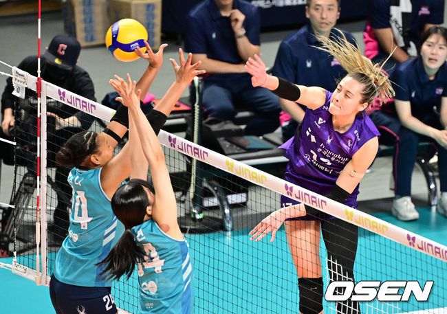 27일 오후 서울 장충체육관에서 프로배구 진에어 2025~26 V리그 GS칼텍스와 흥국생명의 경기가 열렸다. GS칼텍스는 7승 9패(승점23, 4위), 흥국생명은 9승 8패(승점28, 3위)를 기록중이다. 1세트 흥국생명 레베카가 GS칼텍스 블로킹을 피해 강타를 날리고 있다. 2025.12.27 /jpnews@osen.co.kr
