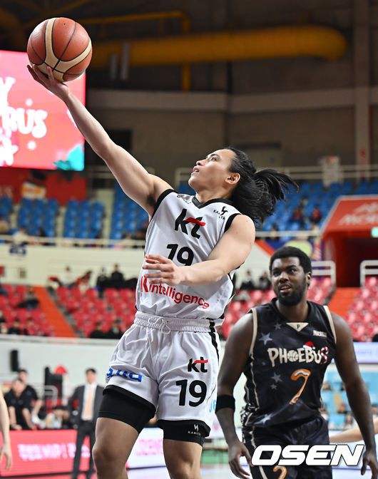 27일 울산 동천체육관에서 2025-2026 LG전자 프로농구 울산 현대모비스와 수원 KT의 경기가 열렸다. 울산 현대모비스는 순위 상승을 위한 결정적 전환점을 모색하고 있고, 3연패에 빠진 수원 KT 역시 반등이 절실한 상황에서 두 팀이 맞대결한다. 수원 KT 조엘 카굴랑안이 울산 현대모비스 레이션 해먼즈의 마크를 피해 골밑슛을 시도하고 있다. 2025.