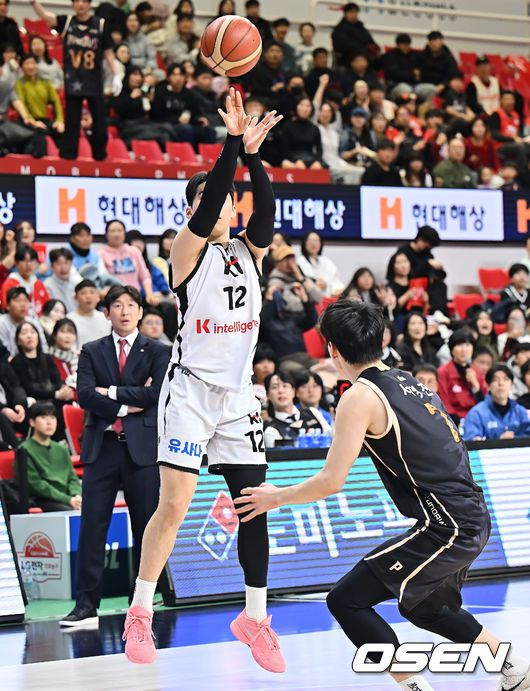 27일 울산 동천체육관에서 2025-2026 LG전자 프로농구 울산 현대모비스와 수원 KT의 경기가 열렸다. 울산 현대모비스는 순위 상승을 위한 결정적 전환점을 모색하고 있고, 3연패에 빠진 수원 KT 역시 반등이 절실한 상황에서 두 팀이 맞대결한다. 수원 KT 문정현이 울산 현대모비스 서명진의 마크를 피해 3점슛을 시도하고 있다. 2025.12.27 /