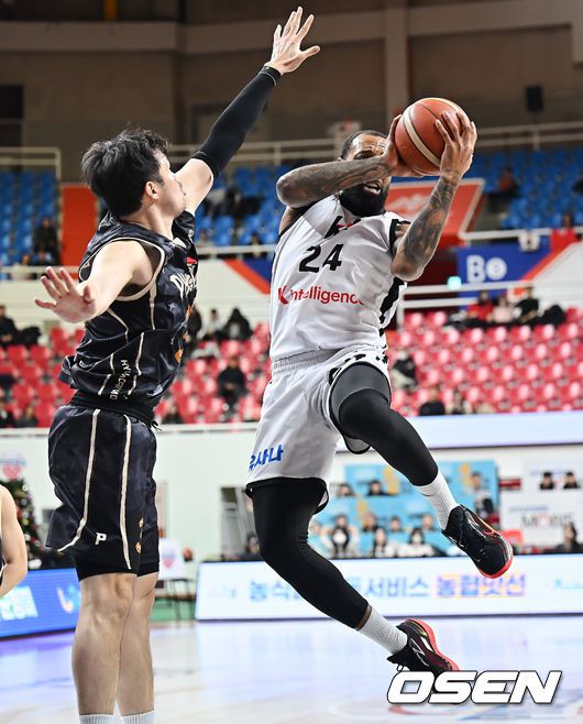 27일 울산 동천체육관에서 2025-2026 LG전자 프로농구 울산 현대모비스와 수원 KT의 경기가 열렸다. 울산 현대모비스는 순위 상승을 위한 결정적 전환점을 모색하고 있고, 3연패에 빠진 수원 KT 역시 반등이 절실한 상황에서 두 팀이 맞대결한다. 수원 KT 데릭 윌리엄스가 울산 현대모비스 이승현의 마크를 피해 골밑슛을 시도하고 있다. 2025.12.2
