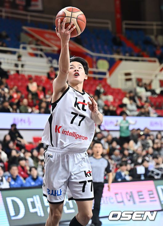 27일 울산 동천체육관에서 2025-2026 LG전자 프로농구 울산 현대모비스와 수원 KT의 경기가 열렸다. 울산 현대모비스는 순위 상승을 위한 결정적 전환점을 모색하고 있고, 3연패에 빠진 수원 KT 역시 반등이 절실한 상황에서 두 팀이 맞대결한다. 수원 KT 강성욱이 속공에 이은 골밑슛을 시도하고 있다. 2025.12.27 / foto0307@osen.