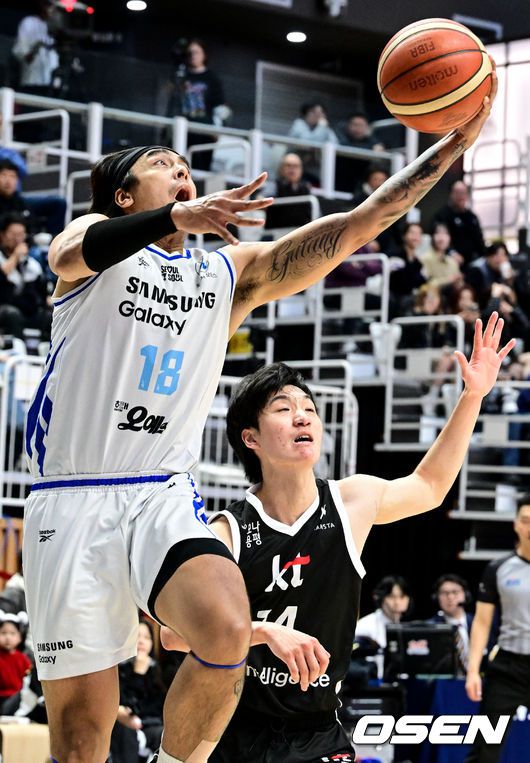 30일 오후 서수원칠보체육관에서 2025-2026 LG전자 프로농구 수원 KT 소닉붐과 서울 삼성 썬더스의 경기가 열렸다. 수원 KT는 12승 14패로 6위, 서울 삼성은 9승 16패로 7위를 기록 중이다. 1쿼터 삼성 구탕이 슛을 시도하고 있다. 2025.12.30 /cej@osen.co.kr
