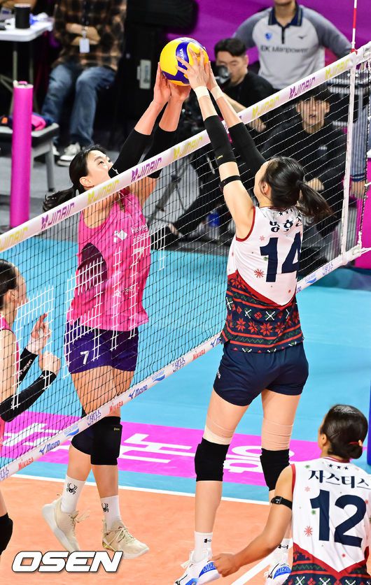 31일 오후 인천 삼산체육관에서 프로배구 진에어 2025~26 V리그 흥국생명과 현대건설의 경기가 진행됐다. 흥국생명은 9승 9패 승점 29점으로 3위를, 현대건설은 12승 6패 승점 36점으로 2위를 차지하고 있다. 2세트 현대건설 양효진과 흥국생명 최은지가 공을 다투고 있다. 2025.12.31 / soul1014@osen.co.kr