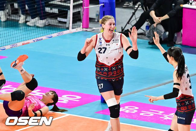 31일 오후 인천 삼산체육관에서 프로배구 진에어 2025~26 V리그 흥국생명과 현대건설의 경기가 진행됐다. 흥국생명은 9승 9패 승점 29점으로 3위를, 현대건설은 12승 6패 승점 36점으로 2위를 차지하고 있다. 2세트 현대건설 카리가 블로킹 성공한뒤 기뻐하고 있다. 2025.12.31 / soul1014@osen.co.kr