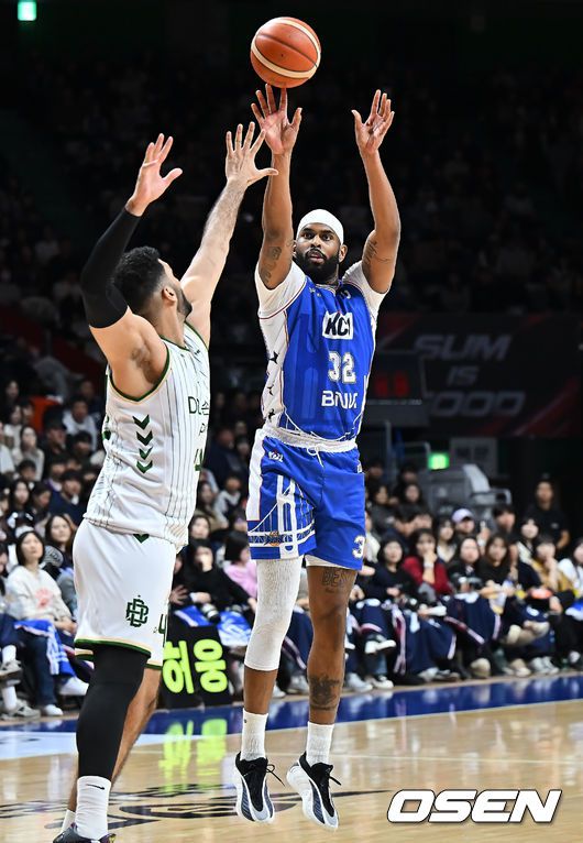 31일 부산 사직체육관에서 2025-2026 LG전자 프로농구 부산 KCC와 원주 DB의 경기가 열렸다. 2025년 마지막 경기가 8번째 농구영신으로 열렸다. 부산 KCC 드완 에르난데스가 원주 DB 에삼 무스타파의 마크를 피해 3점슛을 시도하고 있다. 2025.12.31 / foto0307@osen.co.kr
