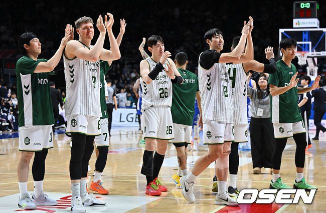 31일 부산 사직체육관에서 2025-2026 LG전자 프로농구 부산 KCC와 원주 DB의 경기가 열렸다. 2025년 마지막 경기가 8번째 농구영신으로 열렸다. 원주 DB 선수들이 99-82로 승리한 후 팬들에게 감사 인사를 하고 있다. 2025.12.31 / foto0307@osen.co.kr