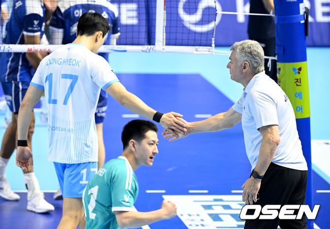 1일 오후 인천 계양체육관에서 진에어 2025-2026 V리그 남자부 대한항공과 삼성화재의 경기가 진행됐다. 대한항공은 14승 3패(승점 40)로 리그 1위를 달리고 있다. 삼성화재는 3승 15패(승점 10)로 리그 최하위를 기록 중이다. 1세트 대한항공 헤난 감독이 득점을 올린 임동혁과 손을 맞대고 있다. 2026.01.01 /cej@osen.co.kr